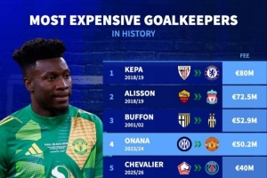 开云体育-门将转会费排名:凯帕8000万欧居首,阿利森、布冯、奥纳纳前四